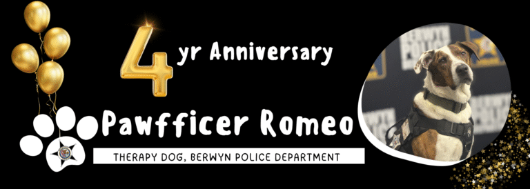 The Berwyn Police Department is proud to celebrate the 4-year anniversary of one of its most beloved team members, Pawfficer Romeo, the department’s dedicated therapy dog, whose compassion, charm, and calming presence have made an immeasurable impact on the Berwyn community.