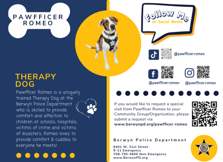 The Berwyn Police Department is proud to celebrate the 4-year anniversary of one of its most beloved team members, Pawfficer Romeo, the department’s dedicated therapy dog, whose compassion, charm, and calming presence have made an immeasurable impact on the Berwyn community.